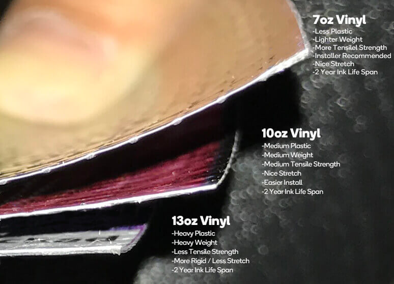 Billboards Etc prints outdoor vinyl banners using 13oz or 18oz heavy-duty vinyl, UV-resistant inks, and reinforced grommeted hems for long-lasting installations in all seasons.